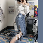 NEWスタイルスタンダードハイウェストウェスト薄手スリットストラップ ジーンズ レディース レトロ ストリート 原宿 ピュア ウエスト Studios83791842062 | pLegLad Studios