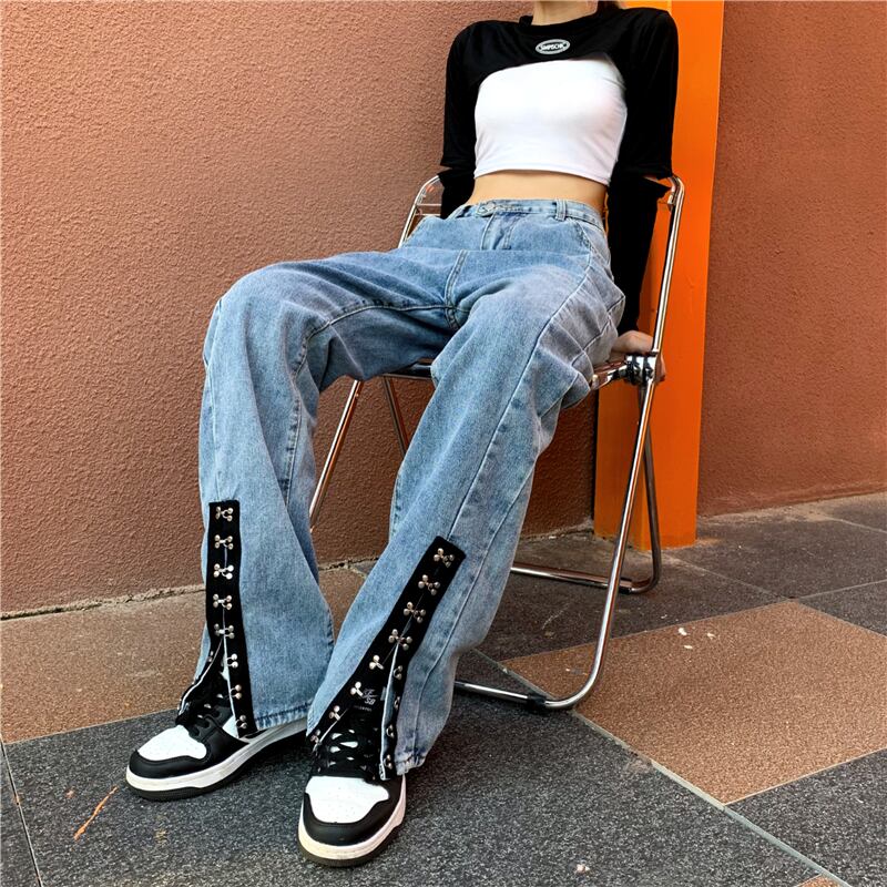 ブレストスリットジーンズ レディース韓国ファッションNEWスタンダードルーズ薄手ウェスト レトロ ワイドレッグ ワイドパンツ スタイル ウエスト Studios79803416810 | pLegLad Studios